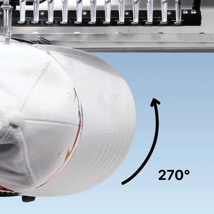 - 270° cap system for full-coverage hat embroidery and versatility.