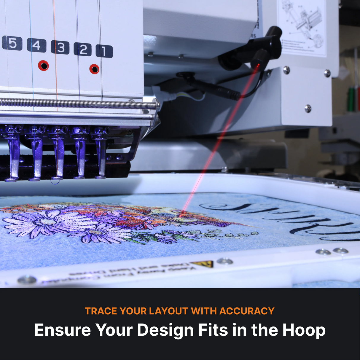 The laser projects an outline of your design directly onto the fabric, showing you exactly where each stitch will land. This ensures that your design stays within the hoop area and avoids misalignments, reducing the chance of needle breakage and stitching errors.