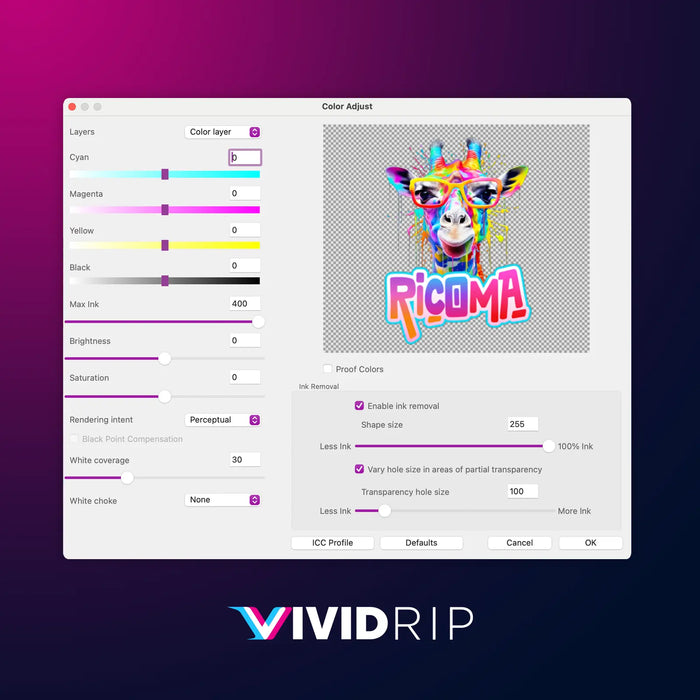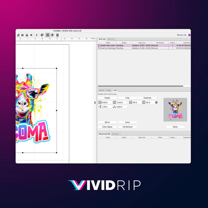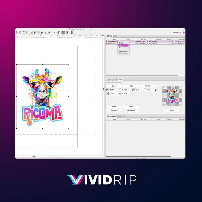 VividRIP is versatile RIP software for Mac and PC, designed for DTF, DTG, and DTP printers. It offers advanced color management, high-resolution output, seamless integration with design tools, an intuitive interface, and automated job queuing for efficient, high-quality printing.